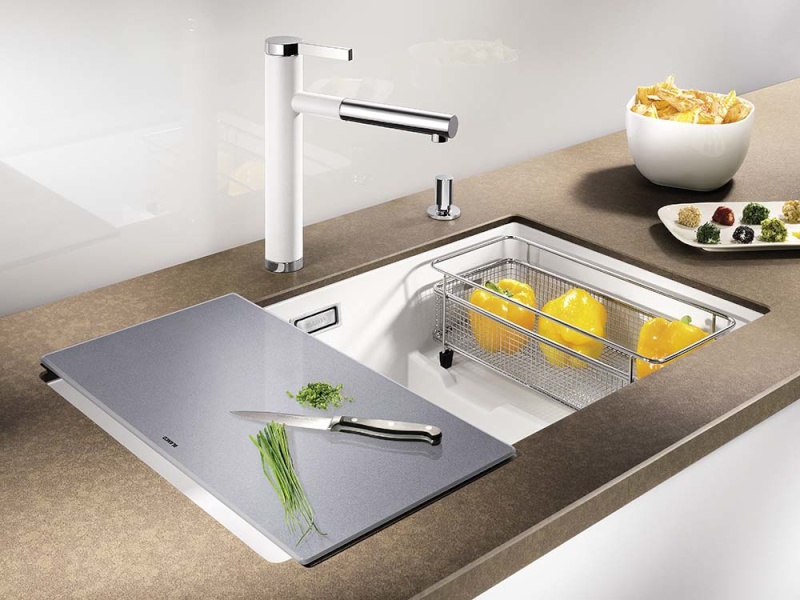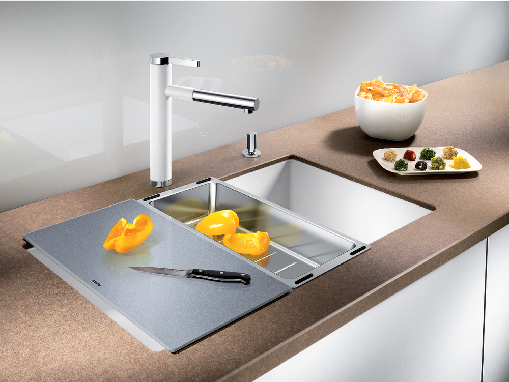 Разделочная доска из серебристого закаленного стекла Blanco Subline 227697 идеально подходит для моек Blanco серии Subline и Andano.
